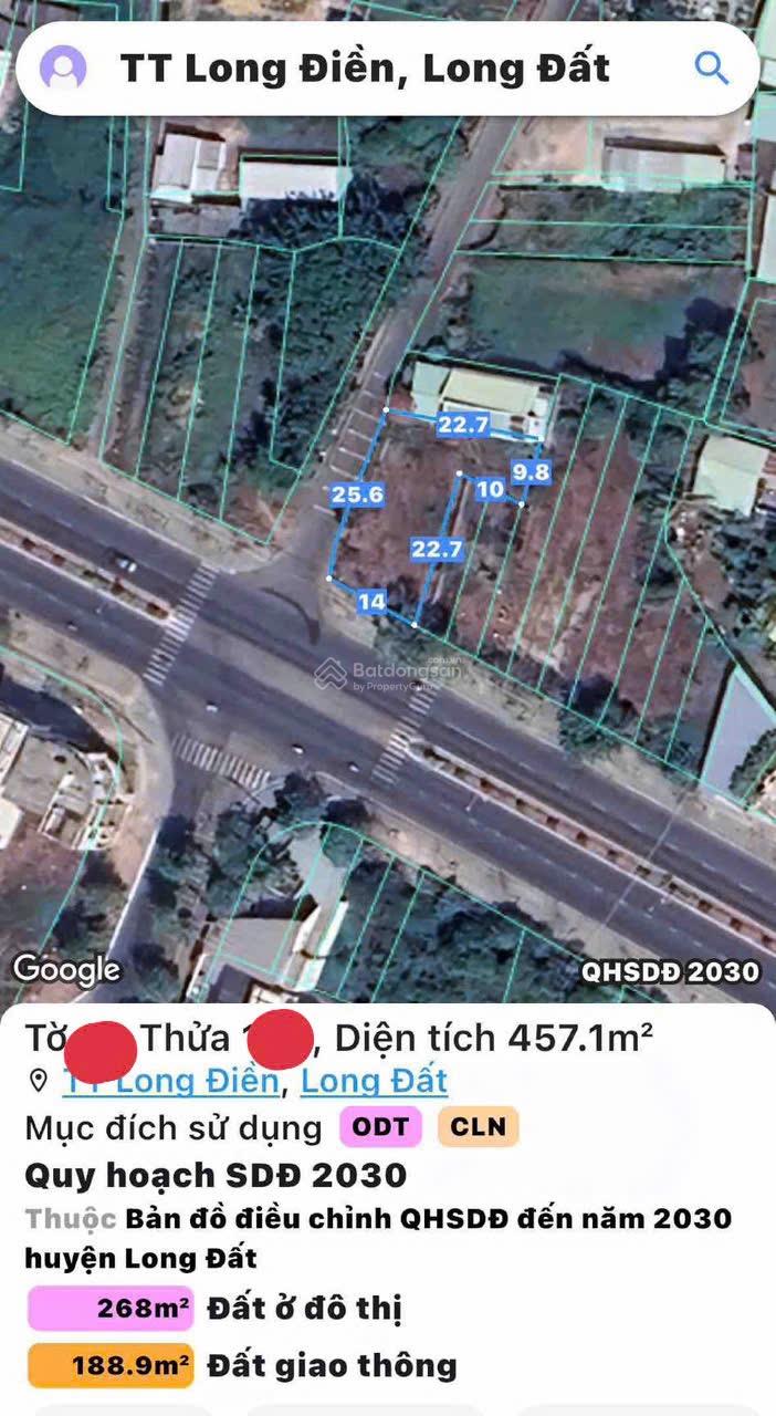 Lô góc Trần Hưng Đạo và Dương Bạch Mai, Thị trấn Long Điền, Bà Rịa Vũng Tàu, với diện tích 457.2m2