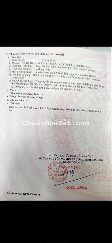 Đất mặt tiền Quốc Lộ 1A, có 200m2 thổ cư, Trung tâm Vĩnh Lợi, Bạc Liêu