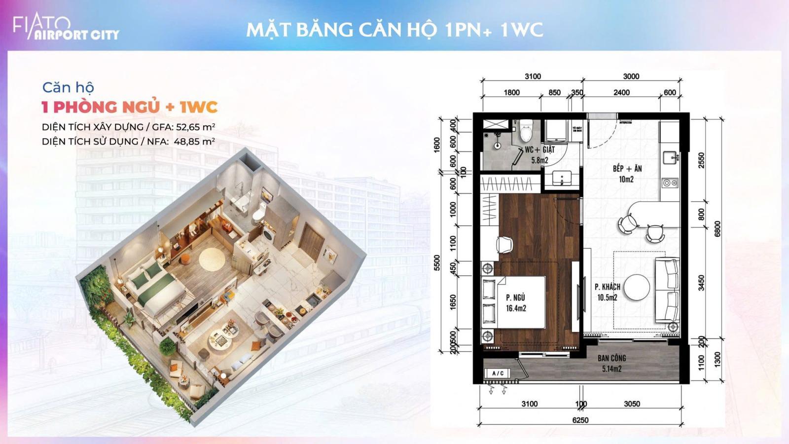 Bán căn 1 Phòng Ngủ, 53m2, dự án FIATO AIRPORT CITY, tầng 8 , vị trí đẹp, giá chỉ 2 tỉ 050