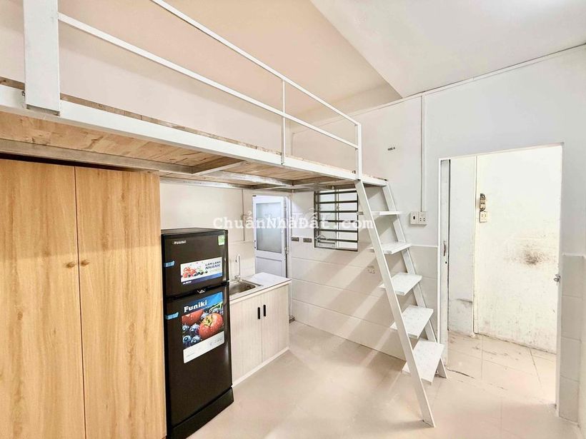 Phòng gác lửng, rộng khoảng 15m2, full nội thất tủ quần áo, kệ bếp, tủ lạnh, máy lạnh inverter đời mới tiết kiệm điện. WC riêng. Đặc biệt gác lửng cao 1m6 đứng thoải mái.