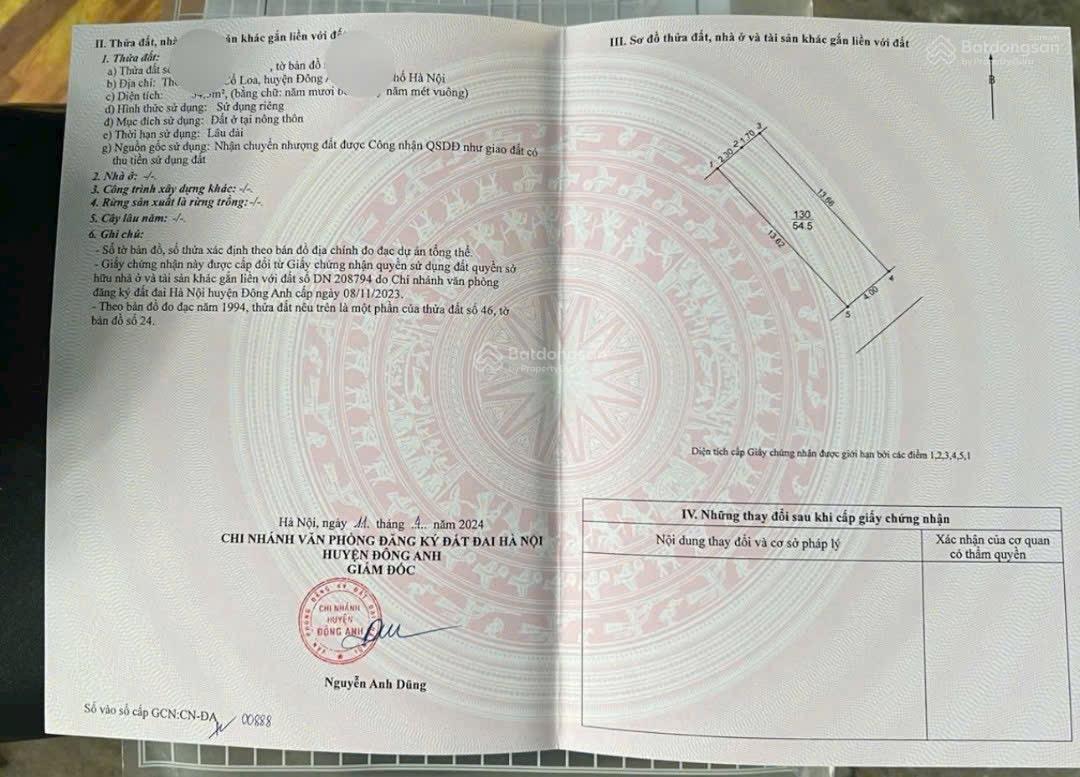 BÁN ĐẤT XÓM GÀ CỔ LOA ĐÔNG ANH HÀ NỘI Giá bán 4.850 tỷ. Diện tích: 54.5m2