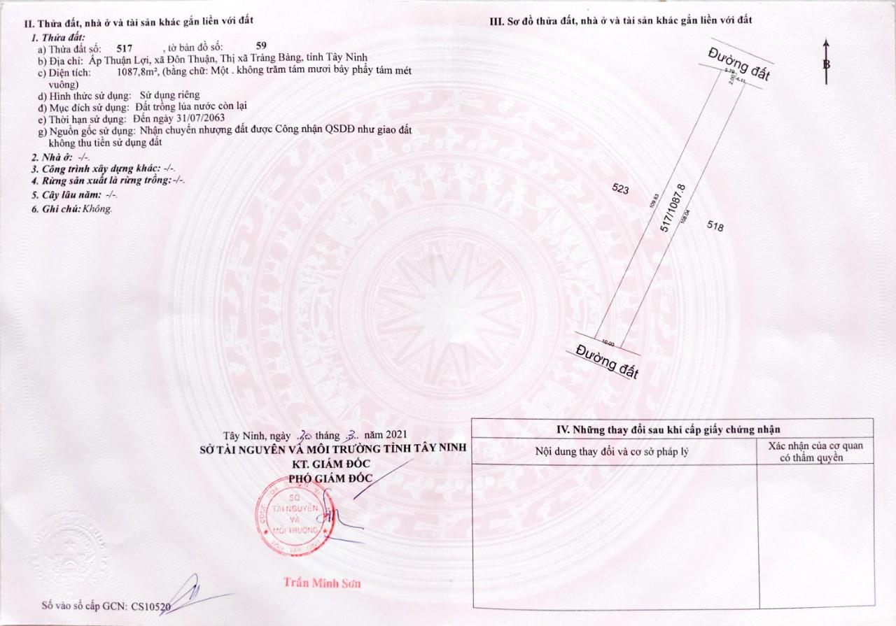 Đất hai mặt tiền 10x100m tại Đôn Thuận Trảng Bàng Tây Ninh. Chỉ 850 triệu